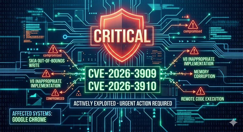 - CVE-2026-3909 (Out-of-bounds write in Skia): A flaw in the graphics engine that can lead to memory corruption and potential code execution.
